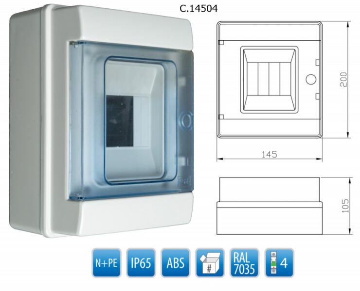 Termék leírása: PAWBOL Falon kívüli elosztódoboz, füst színű ajtóval, N+PE sínnel , 4 modullal, IP65Méret: 105x145x200mm