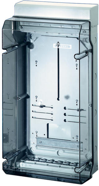 fogyasztásmérő szerelőlappal és fogyasztásmérő rögzítőcsavarokkal kábelbeve zetés integrált, rugalmas tömítőmembránokon keresztül kábelbevezető burkolattal átlátszó fedéllel plombálható Fedélzárás szerszámmal Méretlen helyen történő használata esetén egyeztessen a helyi áramszolgáltatóval. Mellékelt tartósínnel méret: 295x583x1 82 mm max. beépítési m