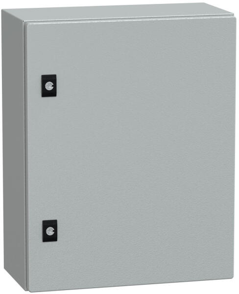 Méretek: - magasság (H): 300 mm - szélesség: (W): 200 mm - mélység (D): 150 mm Egy ajtós Szigetelési feszültség: 1000V Névleges áram: 630A Lemezvastagság 1,2 mm IP védettség: IP66 A szekrények tartalmazzák a horganyzott szerelőlapot és a kábelbevezető lemezt Az ajtónyitási irány megváltoztatható Elektrosztatikus úton festett Szín RAL-7035 Galvanizált szerelőlap