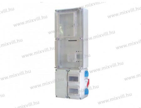 Méret: 300 x 900 x 170 mm Háromfázisú fogyasztásmérőhöz 2 db alsó elhelyezésű, 150x300x170mm-es kábelfogadó szekrénnyel Az elmenő oldalon 2 db 138 mm hosszú, magasított TS35 kalapsínnel 2 db 6 modulos, csapófedeles ablakkal A szekrény oldalán 2 db 3P 16A/230V, 1 db 5P 16A/400V dugalj található A kábelfogadó oldal 1 db 138 mm hosszú, TS35 kalapsínnel szerelve 4 pólusú,
