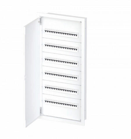 Omu system FES108RBF 108 modulos 2x6x18 modul süllyesztett fém elosztószekrény fehér IP30 RAL9003 Kulcsos zár beépítési lehetőség Az ajtó bal, vagy jobb oldalra történő nyitási iránya megváltoztatható a keret szétszerelése nélkül Modulszám: 108modul (2x6x18) Méret: 470 x 945 x 126 mm Beépítési méret: 428 x 903 x 122 mm IP védettség: IP30 Szín: RAL9003 fehér Környe
