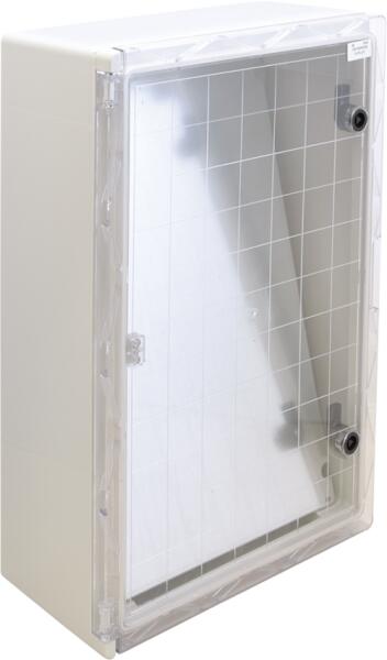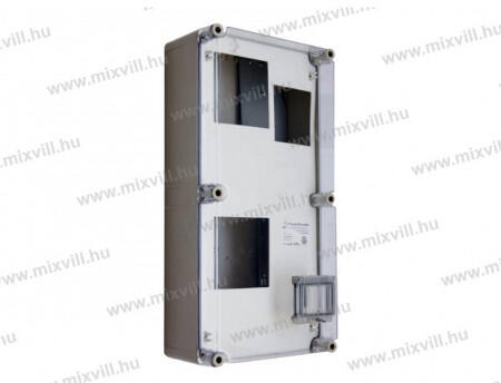 Csatári Plast PVT-3030-FO 3030 egyfázisú fogyasztásmérő tokozat átlátszó fedéllel, kábelfogadó tokozattal 1 db alsó elhelyezésű, 300 x 300 x 170 mm méretű kábelfogadó tokozattal 1 db 290 x 290 x 4 mm méretű műanyag szerelőlappal Az elmenő oldalon 1 db 6 modulos, csapófedeles ablakkal 2 db PG36 furattal