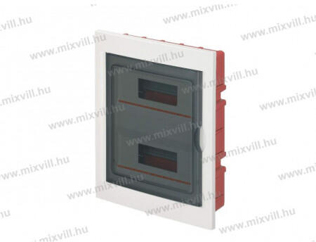 24 modulos kivitelben Föld vagy nulla sínnel Fehér keret Nyitható füstszínű polikarbonát ajtó Ellenálló narancsszínű, polisztirén elosztódoboz Öntapadós címke az áramkörök feliratozásához A kötődobozban sorkapcsok elhelyezhetőek Takarócsík a nem használt modulok elrejtéséhez Galvanizált acél DIN sín, a kivehető és állítható síntartóra szerelve IP védetts