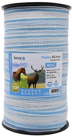 Fencee villanypásztor szalag, - kék / fehér 200 m x 40 mm, 0.18 ohm/m, 120 kg - 8595221016937 - Villanypásztor lovak számára - Kiemelkedő vezetőképességű villanypásztor szalag UV védelemmel. Szélesség 40 mm, lótartásra kifejezetten alkalmas. Hosszú távú m