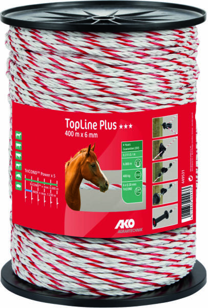 Az AKO TopLine PLUS kimagasló vezetőképességet és rendkívül hosszú élettartamot garantál közepes és hosszú kerítésrendszerek esetén. Az azonos vastagságú, rozsdamentes huzalokkal való összehasonlításból kiderül, hogy a TopLine PLUS termékcsaládba tartozó szalagok, vezetékek és kötelek vezetőképessége az új TriCOND vezetőanyag használatának köszönhetően ötsz