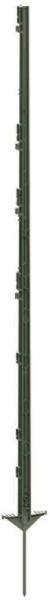 Villanypásztor karó, műanyag 156 cm Lovak, csikók és bikák számára tervezett, zöld színű villanypásztor karó. A villanypásztor karón szalag, kötél, zsinór és huzal rögzítése egyaránt lehetséges. Lovak, csikók és bikák esetén célszerű a felső vezetéknek széles szalagot használni, ami optikailag is távol tartja az állatot a villanypásztor kerítéstől. A karó a