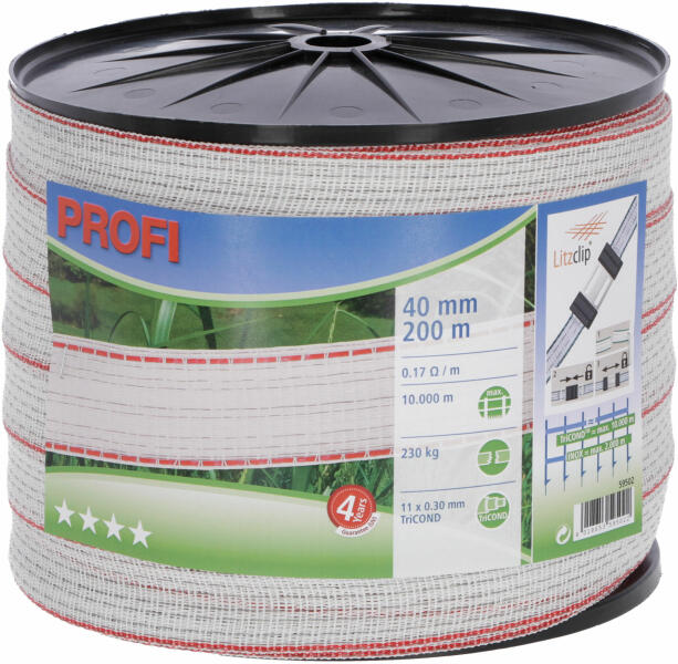 Villanypásztor szalag (PROFI) Kimagasló minőségű TriCOND anyagból készült vezető szálakkal, amellyel a hagyományos villanypásztor vezetőszálakhoz képest 5x jobb vezetőképesség érhető el, azaz akár 5x akkora villanypásztor kerítésrendszert üzemeltethet. Erősített polietilén szálaknak köszönhetően rendkívül erős szakítószilárdságú. 4 évig garantáltan UV-áll
