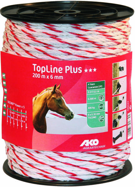 Termék részletekAz AKO TopLine PLUS villanypásztor kötél kimagasló vezetőképességet és rendkívül hosszú élettartamot garantál közepes és hosszú kerítésrendszerek esetén. Az azonos vastagságú, rozsdamentes huzalokkal való összehasonlításból kiderül, hogy a TopLine PLUS termékcsaládba tartozó szalagok, vezetékek és kötelek vezetőképessége az új TriCOND vezetőanyag használatán