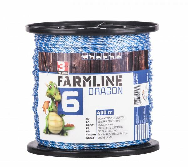 FarmLine Dragon 6 - villanypásztor vezeték 400 m - 4018653946282 - Villanypásztor szalagok - hossz: 400 m, vagy 1000 m ajánlott kerítéshossz: 18 000 m ellenállás: 0,125 Ohm vezetőszálak: 3 x 0,2 mm nemesacél + 3 x 0,25 Cu szakítószilárds - 441983