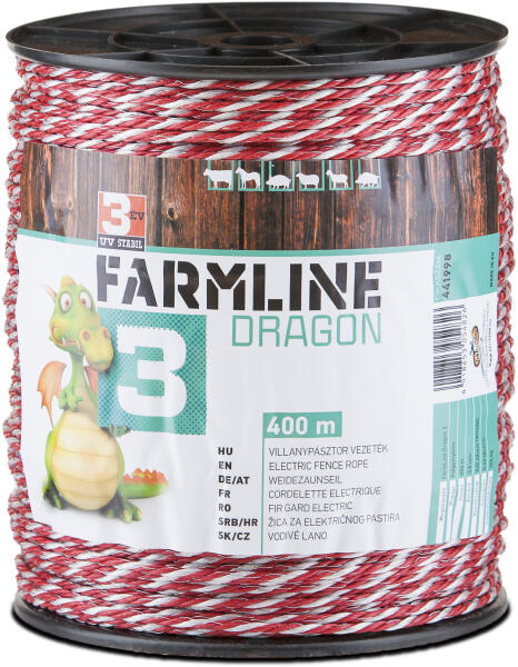 FarmLine Dragon 7 villanypáztor vezeték 400 m - 4018653054802 - Villanypásztor szalagok - hossz: 400 m ajánlott kerítéshossz: 19 000 m ellenállás: 0,11 Ohm vezetőszálak: 3x0,2 mm Niro + 3 x 0,25 Cu szakítószilárdság: 300 kg - 441997