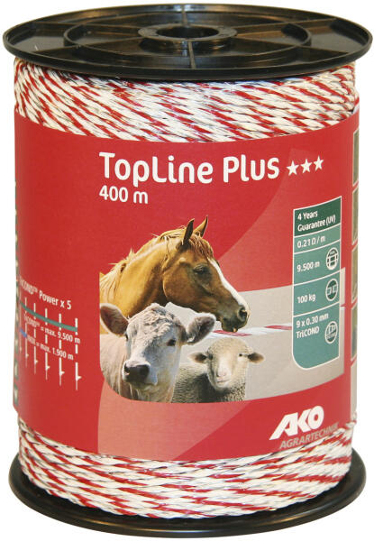 Az AKO TopLine PLUS kimagasló vezetőképességet és rendkívül hosszú élettartamot garantál közepes és hosszú kerítésrendszerek esetén. Az azonos vastagságú, rozsdamentes huzalokkal való összehasonlításból kiderül, hogy a TopLine PLUS termékcsaládba tartozó szalagok, vezetékek és kötelek vezetőképessége az új TriCOND vezetőanyag használatának köszönhetően ötsz