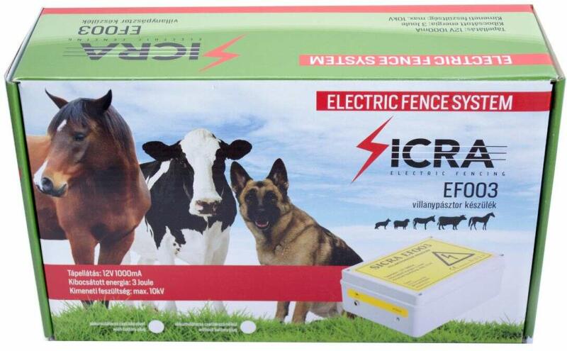 A doboz tartalma: - Sicra EF003 készülék - hálózati adapter - külső akkumulátorhoz csatlakozó Sicra EF003 készülék paraméterei: - Magas feszültségű (~10kV) impulzusok 1-2/mp - Kibocsátott energia: 3 Joule - IP44-es védelem - hatótávolsága max. : 3-5 km Ajánlott: - nagyobb testű vagy hosszú szőrű kutyákhoz - egyéb háziállatok tartására is alkalmazható (bárány, kec