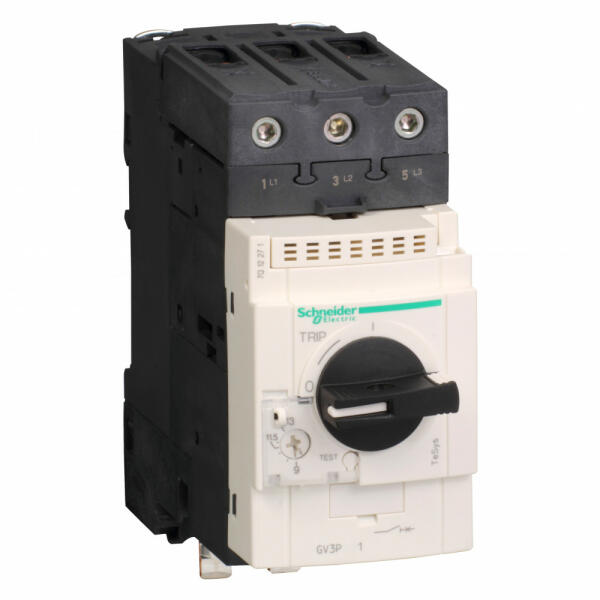TeSys GV3 Termikus-mágneses motorvédõ megszakítók 0,37 … 30 kW-ig Kisméretű termikus-mágneses motorvédõ megszakítók 0,37 … 30 kW-ig Jellemzők Az 55 mm-es szabványos szélességnek és DIN-sínre szerelésnek köszönhetően egyszerűen beépíthető az összes konfigurációba. GV3 P termikus-mágneses megszakító: 7 tartomány 9 és 65 A között mágneses és termikus motorvé