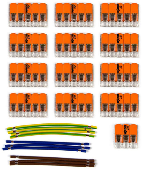 Kiegészítőkészlet tizenhárom lyukú mennyezeti rózsakábelezéshez. A készlet tartalma: - 12 db 5 pólusú átlátszó univerzális kapocs - 1 db 3 pólusú átlátszó univerzális kapocs - 10 db egypólusú kábelszakasz, amely összekötő hídként használható Az átlátszó tartályból jól látható, hogy a vezetékek megfelelően vannak-e csatlakoztatva, és megfelelő hosszúság