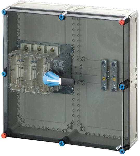 HENSEL Mi 7849 Mi biztosító kombinációs szekrény (1093386) Termék információ: Bizto sítós terheléskapcsoló (Fuserbloc) szekrény 1 x NH 2, 3-pólus MSZ EN 60947-3 szerint beépített készülékkel Csatlakoztatás: M 10 vagy VA 400 + Mi VS 400 (a kapocstechnikát ld. a Műszaki adatoknál) M 10-es PE- és N kapcsok Zárható kapcsolókar Fedélzárás szerszámmal Plombálható Alapany