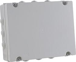 JANGAR Kötődoboz membrános 410x306x128mm IP65 ÚJ (membránok a dobozban!!) (JG-2715) Termék információ: Kötő doboz Anyaga: ABS Méret: 410x306x128 mm IP védettség: IP65 IK védettség: IK08 Megengedett hőmérséklet: -25°C/+85°C Izzóhuzal teszt: 960 °C Kivitel: falon kívüli Típus: Kúpos kábelkivezetős oldalfalú Forma: szögletes Színe: szürke