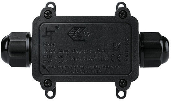 Névleges feszültség: 450 V Test színe: Black Névleges áram: 24 A Pólusok száma: 3 IP68 Vezeték szakasz: 0,5-2,5mm2 Nyílások száma: 2 Az anyag típusa: UL94V-2 Fire and flame retardant Méretek (mm): 161,74 x 66,98 x 38mm