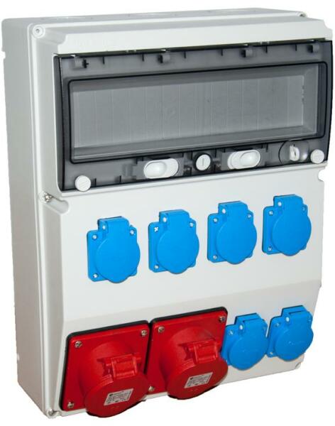 TP ELECTRIC Ipari doboz szerelt 300x400mm, IP44, 2x(5P16A) + 6x(2P+F), gyorscsatlakozós aljzatokkal (TP-3360-600-0502HH) Termékinformáció: Anyaga: műanyag Méret: 300 x 400 mm Előlapon: 2 x ( 5P16A ) gyorscsatlakozós aljzat + 6 x ( 2P +F ) háztartási aljzat IP védettség: IP44 Modulok száma: 15 db 1 soros Kiszerelési egység: 3 db / karton