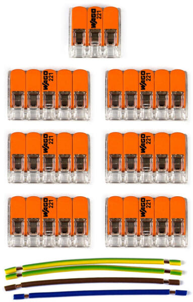 Kiegészítőkészlet hétlyukú mennyezeti rózsakábelezéshez. A készlet tartalma: - 6 db 5 pólusú átlátszó univerzális kapocs - 1 db 3 pólusú átlátszó univerzális kapocs - 4 db egypólusú kábelszakasz, amely összekötő hídként használható Az átlátszó tartályból jól látható, hogy a vezetékek megfelelően vannak-e csatlakoztatva, és megfelelő hosszúságúak-e lec