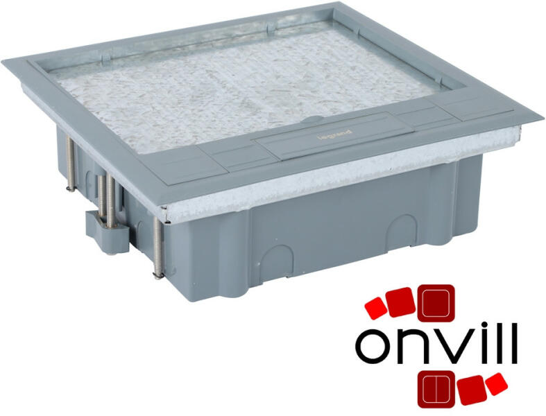 12 modulos padlódoboz Megfelel az IEC/EN 60670-23 szabványnak Padlódobozok műanyag fedéllel - Szerelvények merőleges elhelyezése Program Mosaic szerelvényekkel szerelvényezhető Rögzítő elemekkel együtt szállítva Közvetlenül, egyszerűen beszerelhető álpadlóba Betonpadlóba szereléshez süllyesztődoboz használata szükséges (kat. szám: 0 881 70) Fedél vastagsága ≤ 8mm