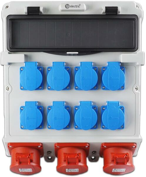 TP ELECTRIC Szerelt ipari doboz 300x340, IP44, 8x(2P+F)+ 3x(5x16A), 14 modulos (TP-3610-800-0503) Termékinformáció: Anyaga: ABS Méret: 300 x 340 mm Előlapon: 8 x (1 x 16A) háztartási dugalj Alsólapon: 3 x (5 x 16A) beépíthető aljzat IP védettség: IP44 Modulok száma: 14 modul