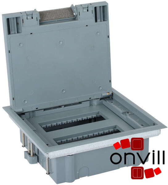 12 modulos padlódoboz Megfelel az IEC/EN 60670-23 szabványnak Padlódobozok műanyag fedéllel - Szerelvények merőleges elhelyezése Program Mosaic szerelvényekkel szerelvényezhető Rögzítő elemekkel együtt szállítva Közvetlenül, egyszerűen beszerelhető álpadlóba Betonpadlóba szereléshez süllyesztődoboz használata szükséges (kat. szám: 0 881 70) Fedél vastagsága ≤ 8mm