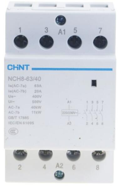 CHINT moduláris mágneskapcsoló NCH8-63 (4P/63A/230V AC/4NO) (NCH8-63/22-230V) Termékinformáció: Moduláris mágneskapcsoló NC8-63-40 Gyakori működésre tervezett (relé) nagy áramú áramkörök kapcsolására Névleges áram: 63A Pólus: 4P Működtető feszültség: 230V AC Érintkezők: 4NO/AC Sínre pattintható