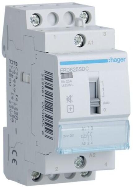 HAGER Csendes mágneskapcsoló, 2Z, 25A, 24V DC, I-0-II, moduláris, növelt kapcs. telj. (ERD625SDC)