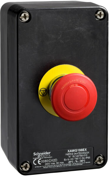 Harmony XAWF ATEX D tokozott vészleállító, gombafejű 40mm, kulccsal oldható, fém, 2NC, piros Schneider XAWF188EX Harmony XAWF ATEX D tokozott vészleállító, gombafejű 40mm, kulccsal oldható, fém, 2NC, piros