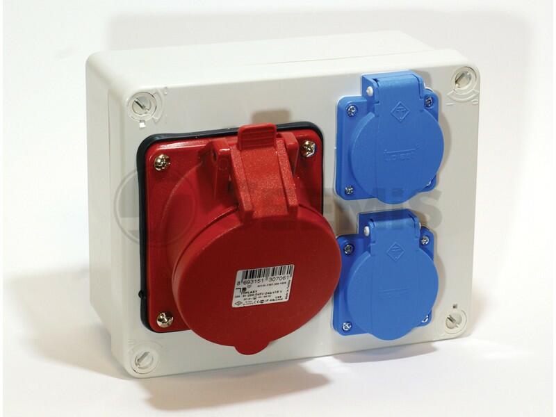 Szerelt ipari doboz - Anyaga: ABS - 2x(2P+F) + 1x(5P16A) - Méret: 180 x 145 x 85 mm - IP védelem: IP44 - Szín: szürke