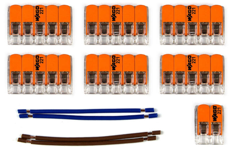 Kiegészítőkészlet kilenclyukú mennyezeti rózsa kábelezéshez. A készlet tartalma: - 6 db 5 pólusú átlátszó univerzális kapocs - 1 db 2 pólusú átlátszó univerzális kapocs - 4 db egypólusú kábelszakasz, amely összekötő hídként használható Az átlátszó tartályból jól látható, hogy a vezetékek megfelelően vannak-e csatlakoztatva, és megfelelő hosszúságúak-e