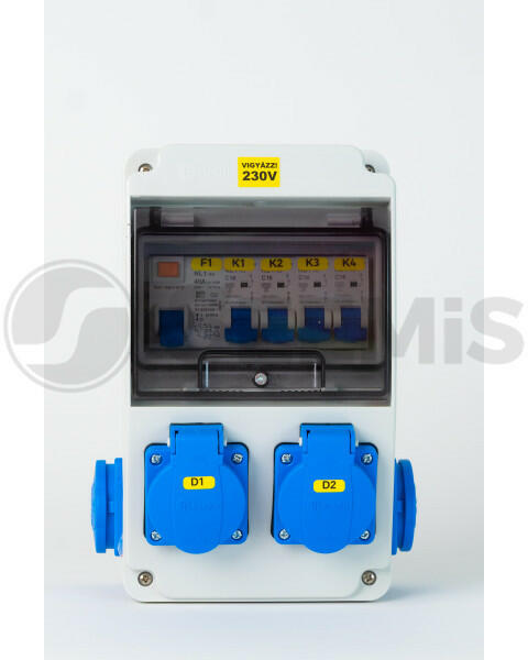 3318-as szerelt ipari doboz installációval, vezetékelve - Anyaga: műanyag - Méret: 130 x 220 mm - Előlapon: 2 x ( 2P+F) háztartási dugalj - Oldalsó lapon: 2 x (2P+F) háztartási dugalj - Installáció: 2 x (1PC16A) kismegszakító - Installáció: 2P40A30mA Fí-relé - Érintésvédelmi osztály: II. Védelmi osztály - IP védettség: IP44 - Modulok száma: 6 db - Vezetékelve - Vezeté