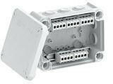 OBO BETTERMANN 2007436 T 100 KL Kötődoboz 151x117x67mm IP54 A T-sorozatú leágazódobozok mindegyike UV-álló. A doboz anyaga hőre lágyuló polipropilén, a lépcsős kábelátvezetőké etilénvinil-acetát (EVA). Ez a műanyag lágy, tehát hajlítható, ezáltal a vezetékek a 10 x M25 tömítéseken át szerelhetők, vagy a tömítések a megfelelő helyeken késsel kerülnek kivágásra