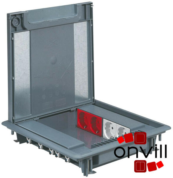 Csökkentett magasságú padlódoboz Megfelel az IEC/EN 60670-23 szabványnak Csökkentett magasságú padlódoboz, 50 mm Program Mosaic szerelvényekkel szerelhető (a szervelvény nem tartozék) 16 modul 50-70 mm-es álpadlóba vagy betonpadlóba Használható süllyesztődobozzal (kat. szám: 0 880 73) betonpadlóba vagy szigetelődobozzal (kat. szám: 0 880 71) álpadlóba Fedéllel szállítv