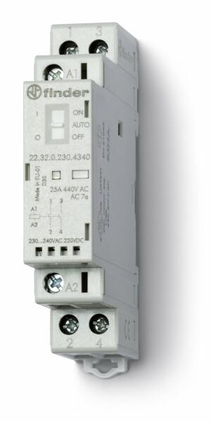 Installációs mágneskapcsoló, 2 záróérintkező 25 A, tápfeszültség: 230 V AC/DC, Auto-Off-On - kapcsoló, LED + mechanikus állapotjelzés 22.32. 0. xxx. 1xx0-ás installációs mágneskapcsolók 25 A, 2 érintkező, AgNi érintkezőanyag, csavaros csatlakozás. Alkalmazhatók ohmikus, mérsékelten induktív és motorterhelésekhez. Főbb jellemzők: 17,5 mm széles A nyitott záróérin