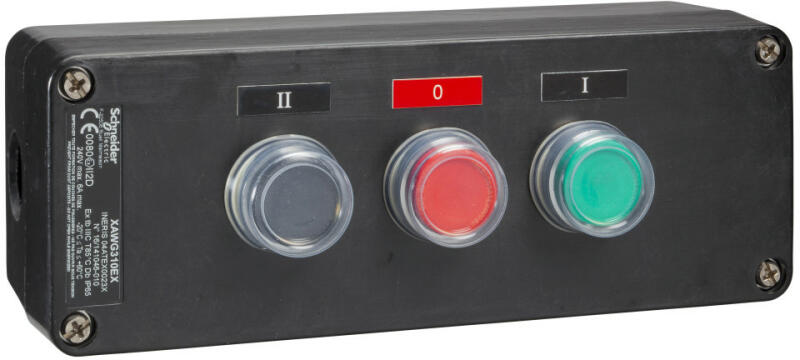 Harmony XAWF ATEX D tokozott hármas nyomógomb, műanyag, 1NO zöld, 1NC piros, 1NO fekete Schneider XAWG310EX Harmony XAWF ATEX D tokozott hármas nyomógomb, műanyag, 1NO zöld, 1NC piros, 1NO fekete