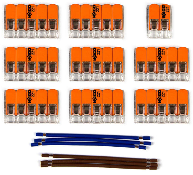 Kiegészítőkészlet tizenhárom lyukú mennyezeti rózsakábelezéshez. A készlet tartalma: - 8 db 5 pólusú átlátszó univerzális kapocs - 1 db 2 pólusú átlátszó univerzális kapocs - 6 db egypólusú kábelszakasz, amely összekötő hídként használható Az átlátszó tartályból jól látható, hogy a vezetékek megfelelően vannak-e csatlakoztatva, és megfelelő hosszúságú