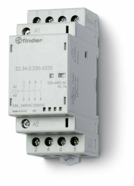 Installációs mágneskapcsoló, 4 záróérintkező 25 A, tápfeszültség: 230 V AC/DC, LED + mechanikus állapotjelzés 22.34. 0. xxx. 1xx0- as típusú installációs mágneskapcsolók 25 A, 4 érintkező, AgNi érintkezőanyag, csavaros csatlakozás. Alkalmazhatók ohmikus, mérsékelten induktív és motorterhelésekhez. Főbb jellemzők: 35 mm széles A nyitott záróérintkezők távolság
