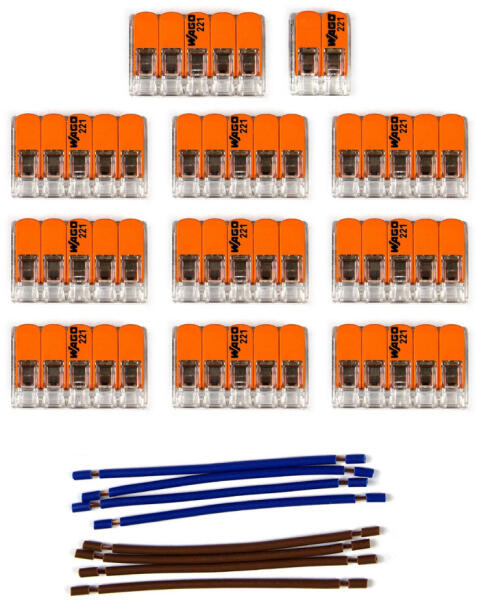 Kiegészítőkészlet tizenöt lyukú mennyezeti rózsakábelezéshez. A készlet tartalma: - 10 db 5 pólusú átlátszó univerzális kapocs - 1 db 2 pólusú átlátszó univerzális kapocs - 8 db egypólusú kábelszakasz, amely összekötő hídként használható Az átlátszó tartályból jól látható, hogy a vezetékek megfelelően vannak-e csatlakoztatva, és megfelelő hosszúságúak