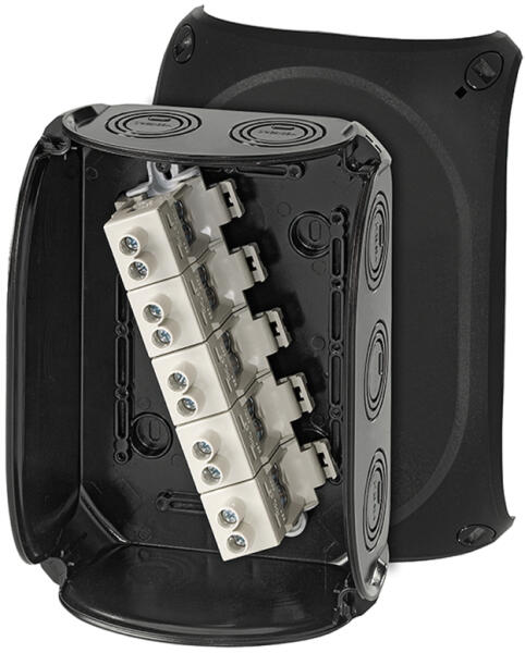 HENSEL KF 1616 B Időjárásálló kábelösszekötő doboz, fekete (62000068) Termé kinformáció: 6– 16 mm2, Cu, 3~ Kapcsokkal, pólusonként 2 db csatlakozással 5 pólusú, pólusonként 6 x 6 mm2 r / f, 4 x 10 mm2 r / f, 4 x 16 mm2 s / f, 4 x 25 mm2 s / f, 2 x 35 mm2 s / f 2 db M 32-es kábelbevezetés a doboz alján Kábelbevezetés kikönnyítéseken keresztül, ASS-t külön kell rendel