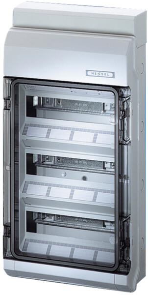 HENSEL FP 1418 Kismegszakító szekrény (68000161) Termé kinformáció: 51 osztásegység: 3 x 17 x 18 mm zárólap készlettel 3 soros 4-es szekrényméret FIXCONNECT® rugós kapocstechnika PE- és N kapcsokhoz PE/N 8 x 25 mm2, 32 x 4 mm2, Cu Különböző potenciálokra szakaszolható N kapocs DIN 43880 szerinti sorolható, legfeljebb 63 A készülékek beépítéséhez Átlátszó ajtó kéz