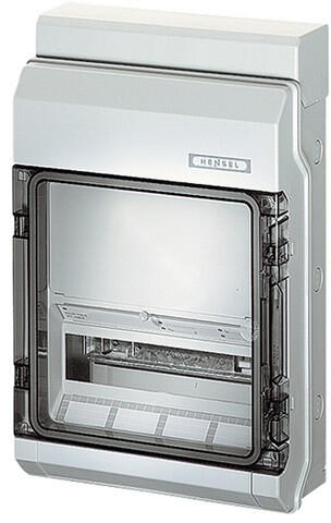 Hensel KV 9220 IP65 kisautomata doboz 12 osztásegység: 1 x 12 x 18 mm PE- és N kapcsok nélkül 1 soros A PE/N kapcsokat külön kell megrendelni 35 mm-es kalapprofilú DIN-tartósínre pattintható készülékek és kapcsok beépítéséhez Járulékos hely a kezelést nem igénylő készülékekhez + 1 db 273 mm széles kalapsín Átlátszó ajtó Az ajtókhoz való zárakat és plombáló k