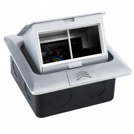 OMU system PD-KM45-4M-AL Padlódoboz 4 modulos, KM45 modulokhoz aluminium soft pop-up tetővel Az OMU system PD-KM45-4M-AL padlódoboz egy elegáns és funkcionális megoldás, amelyet elsősorban elektromos és adatcsatlakozók padlóba történő integrálására terveztek. Az alábbiakban összefoglalom a főbb jellemzőit: Modulok száma és kompatibilitás: A padlódoboz négy modul KM45 típ