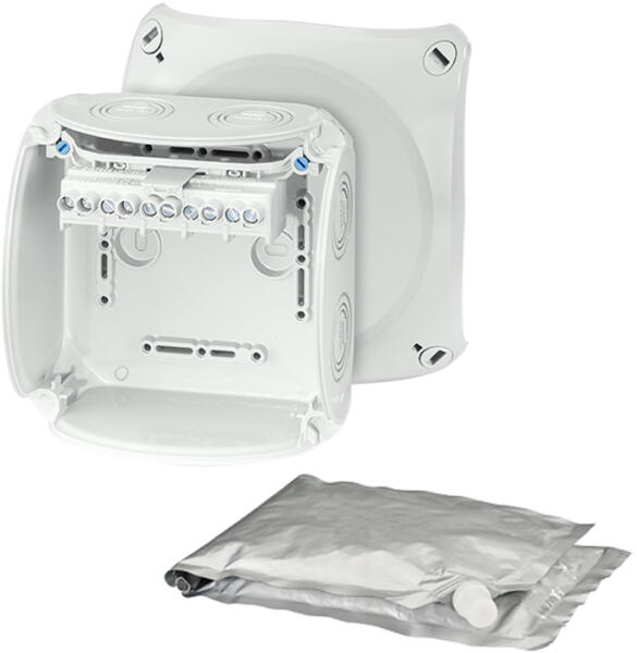 HENSEL WP 0606 G Vízálló kábelösszekötő doboz kiöntőmasszával, szürke (62000105) Termé kinformáció: 1,5 6 mm2, Cu 3~ Kapcsokkal 5 pólusú, pólusonként 6 x 1,5 mm2 r / f, 4 x 2,5 mm2 r / f, 4 x 4 mm2 r / f, 4 x 6 mm2 r / f, 2 x 10 mm2 r / f Kábelbevezetés kikönnyítéseken keresztül, AKM-et külön kell rendelni Kábelösszekötődobo z kiöntőmasszához Földfelszí n alatti