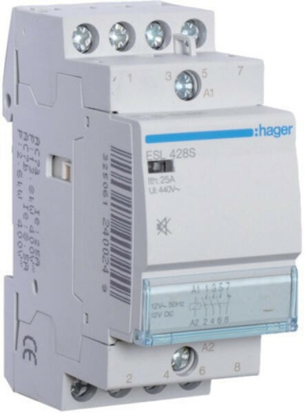 HAGER Csendes mágneskapcsoló, 3Z+1NY, 25A, 12V AC/DC, moduláris (ESL428S)
