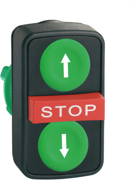 Harmony műanyag kettősfejű nyomógomb fej, Ø22, visszatérő, 1-1 zöld fel/le nyíl nyomógomb, piros kiemelkedő STOP gomb Schneider ZB5AA73134 Harmony műanyag kettősfejű nyomógomb fej, Ø22, visszatérő, 1-1 zöld fel/le nyíl nyomógomb, piros kiemelkedő STOP gomb