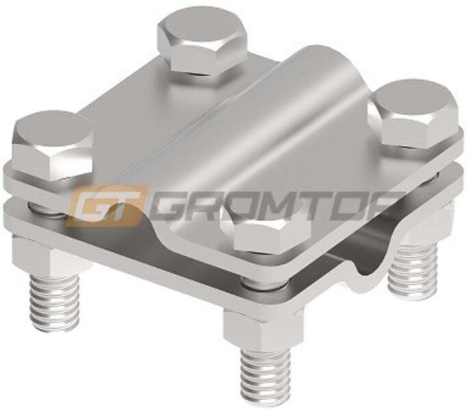 GROMTOR Keresztösszekötő L-55, rozsdamentes acél V2A, d=8-10 mm köracélhoz, 55x55 mm (101113) Terméki nformáció: Kereszt összekötő Anyaga: rozsdamentes acél (V2A) Méret: 55 x 55 mm Köracél keresztmetszete: 8-10 mm Csavar típusa: M8x25 (4 db) Alkalmazás: köracél és T-típusú csatlakozására Maximális villámáram terhelhetősége: 50kA A PN-EN 62561 szabványnak megfelelően