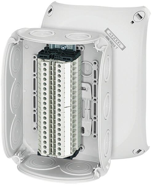 HENSEL RK 1019 T Kábelösszekötő doboz (62000178) Termé kinformáció: 0,14 -6 mm2, Cu 19 db WT 4 sorkapoccsal Csatlakozónként 2 x 0,14-6 mm2 sol / f Wieland gyártmányú sorkapcsok áthidaló sorkapcsokhoz: Wieland IVB WKF 4 gyártmány Írható sorkapocsjelölő Kábelbevezet ő tömszelencék alkalmazása esetén eltávolítható rugalmas tömítőmembránok, tömítési tartomány Ø 9,