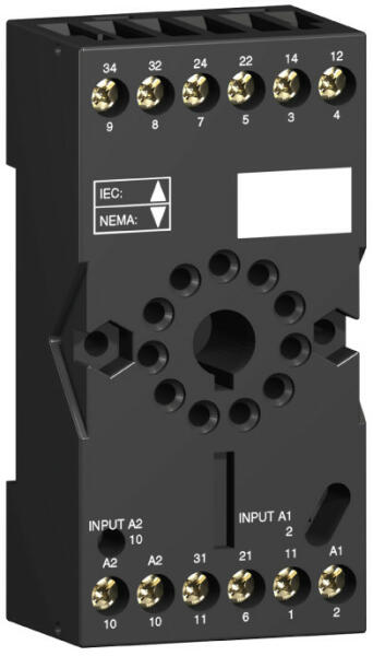 Harmony foglalat, hengeres, univerzális RUM 2CO relékhez, elválasztott elrendezésű, csavaros Ez a relé foglalat 2 C/O hengeres érintkezős Zelio RUM dugaszolható univerzális relékkel kompatibilis, a vezérlőfeszültség szintjétől függetlenül. A foglalat kis helyet foglal és könnyedén rögzíthető DIN sínre, a be- és kimenő vezetékek elválasztott kiosztású csavaros sorkap