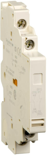 Segédérintkező blokk, oldalsó, Z+NY TeSys GV segédérintkező-blokk motorvédő megszakítókhoz GV2 és GV3. 1NO+1NC pillanatkioldású segédérintkezők. Legfeljebb 6 A/690 V-os váltakozó áram és 6 A/240 V egyenáram működtetésére méretezve. A megszakító bal oldalára szerelendő (2 blokk felszerelhető), csavaros szorítókengyeles csatlakozással. Több szabványnak megfelel (